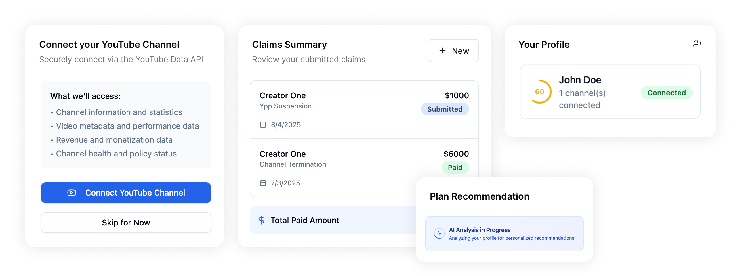 You connect your YouTube channel via secure, read-only API access. We then use your average daily RPM or estimated earnings from the last 90 days and multiply it by your views during demonetization. If your channel had no views (e.g., terminated), we multiply your average daily revenue by the number of days your channel was down. Payouts are capped by your annual plan limit.